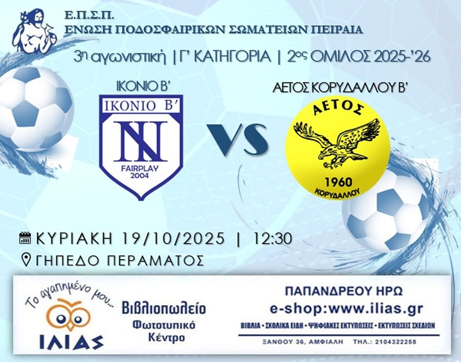 Με αντίπαλο στα μέτρα της παίζει η αναπτυξιακή ομάδα του Νέου Ικονίου, αύριο Κυριακή και ώρα 12:30, στο γήπεδο Περάματος για τον 2ο όμιλο της Γ' Πειραιά. Λέγοντας στα μέτρα της εννοούμε αντίστοιχη Β' ομάδα, όπως είναι αυτή του Αετού Κορυδαλλού. Μην ξεχνάμε ότι από φέτος άλλαξε το σύστημα διεξαγωγής και οι Β' ομάδες αναμετρούνται κανονικά με τις πρώτες ομάδες, σε αντίθεση με τα δύο περασμένη έτη όπου ήταν ένας αποκλειστικός όμιλος μόνο με Β' ομάδες.